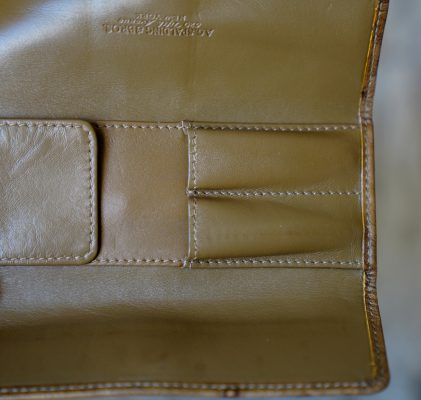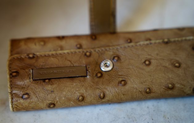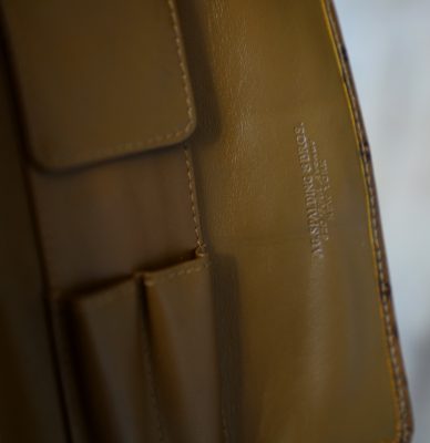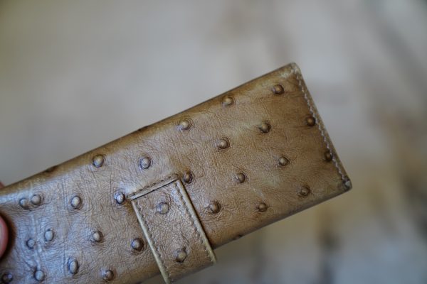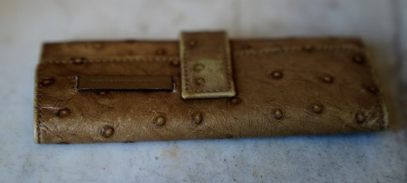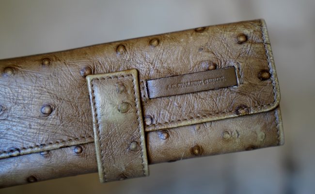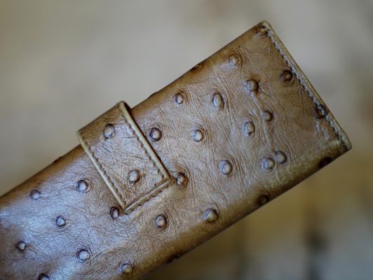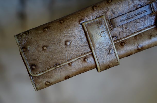 Etui à stylos réalisé en Cuir couleur Kaki, finition Autruche