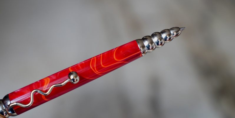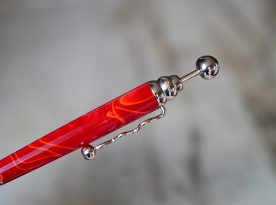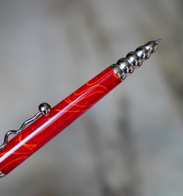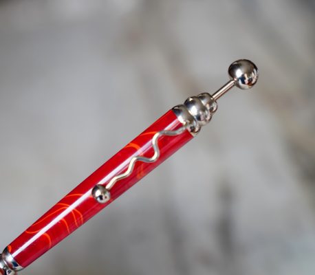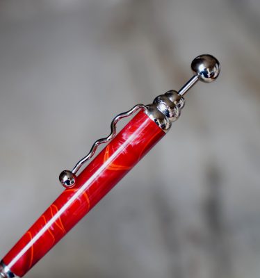 Réalisé en résine rouge marbrée, attributs en métal Chromé