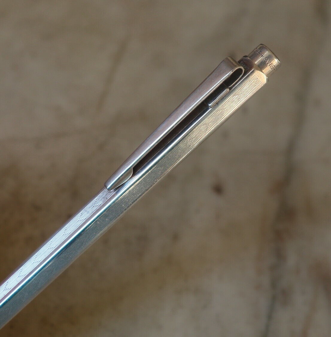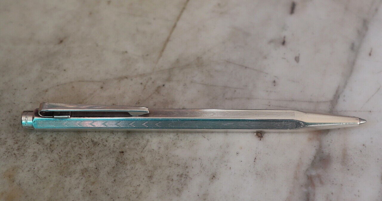 Le stylo bille Caran d’Ache est un modèle en métal guilloché à pans coupés, ce qui lui confère un design élégant et sophistiqué. La mention « CARAN D’ACHE – SWISS MADE » est gravée sur le bouton poussoir, témoignant de la qualité et de l’origine suisse de ce stylo.