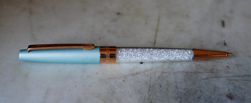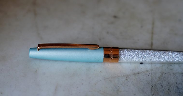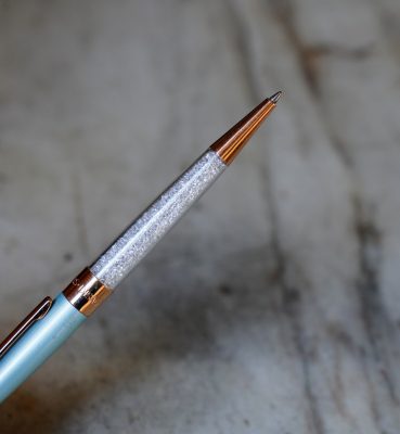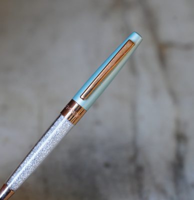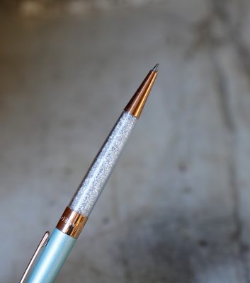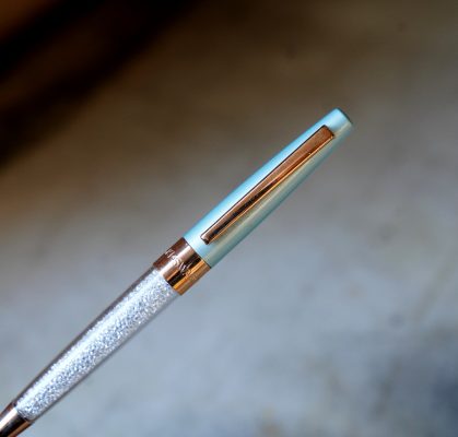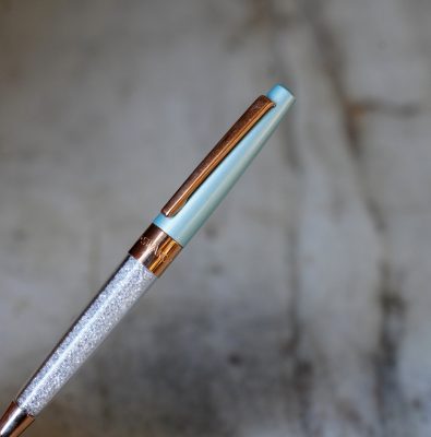 STYLO BILLE SWAROVSKI EN RESINE VERT METALLISE & MOTIF PAILLETE