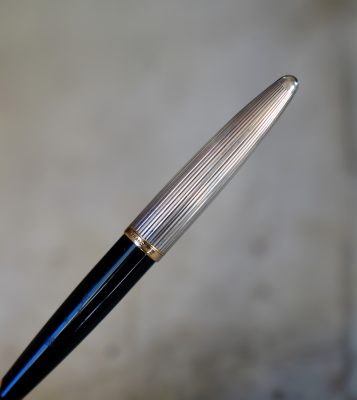 Réalisé Laque Noire & Capuchon métal plaqué Argent, finition Godrons