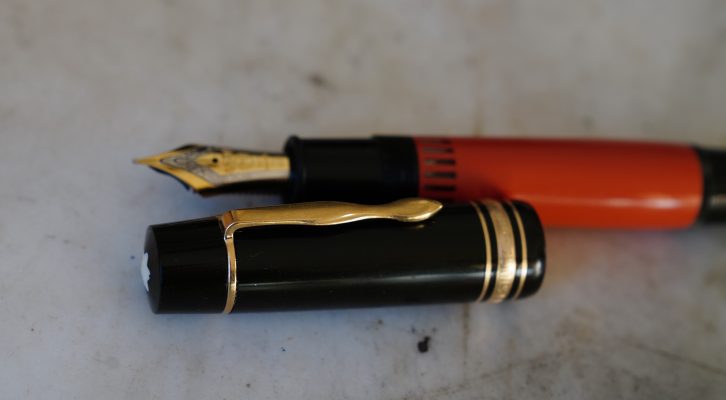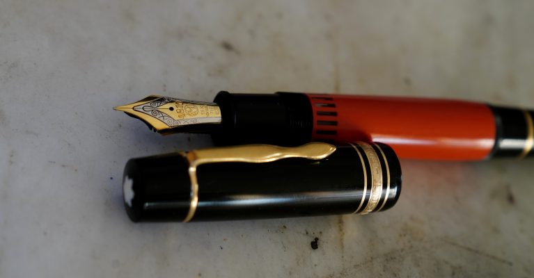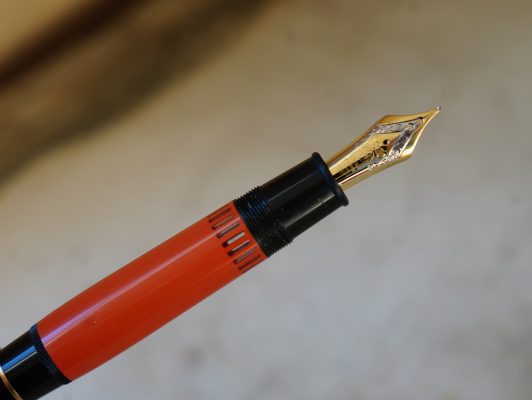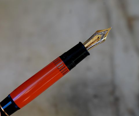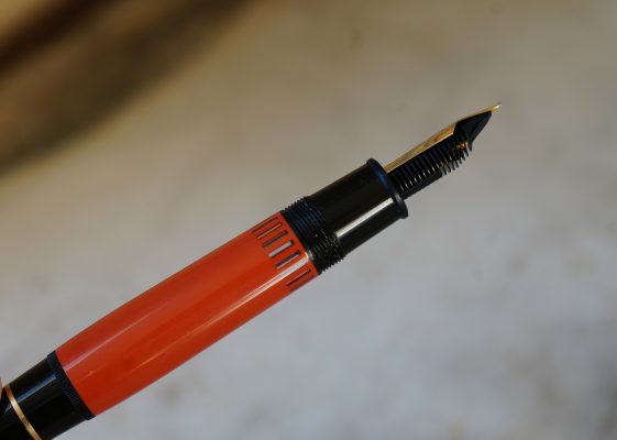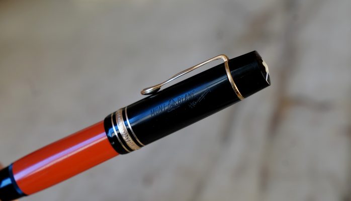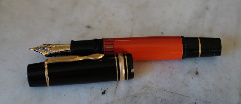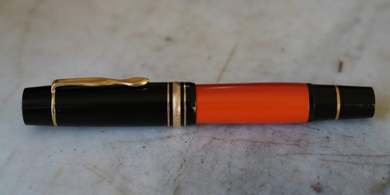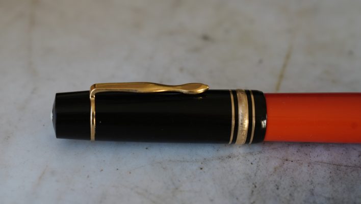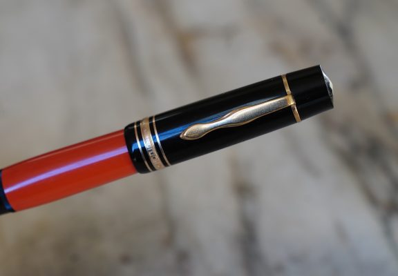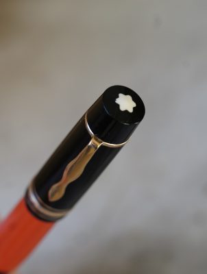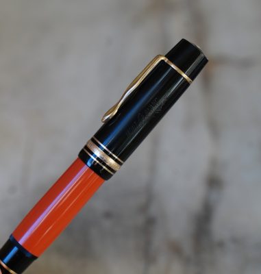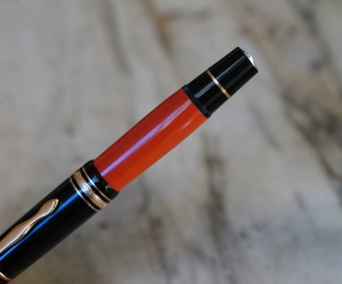 Le Stylo est réalisé en résine rouge orangée et Brun foncé,