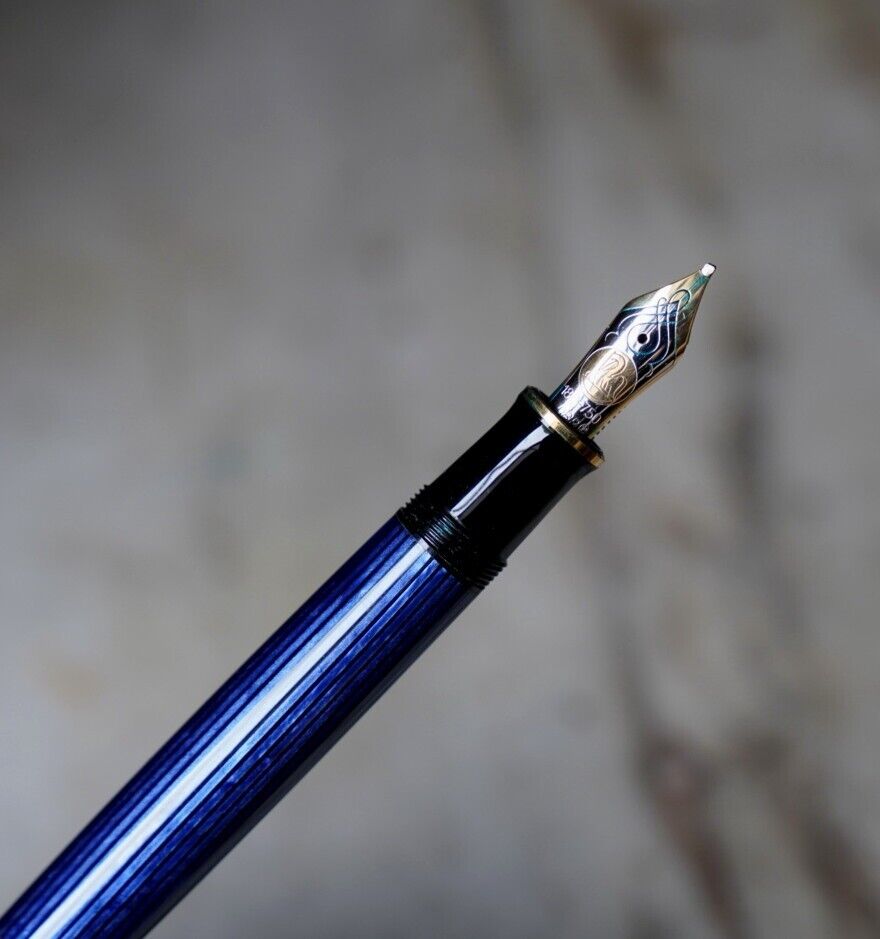Ce stylo plume Pelikan M 800 est en très bon état, témoignant de sa qualité et de sa durabilité. Sa plume en or massif 18 carats est magnifiquement ciselée, et la mention gravée « 18 C – 750 – OBB » ajoute une touche d’élégance supplémentaire. La plume est de taille oblique large, offrant une expérience d’écriture unique et agréable.