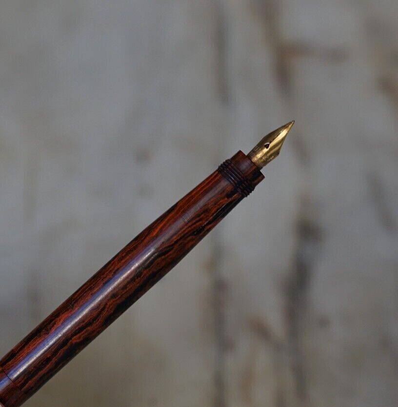 Stylo plume Safety en ébonite boisée rare et ancien plume UNIC en or 18 carats. Système de remplissage goutte à goutte. Ecriture plutôt fine et plume flexible, gravé le chiffre « 120 » sur l’embout du fût.