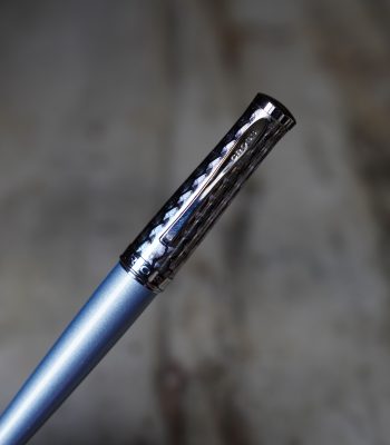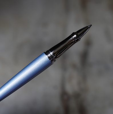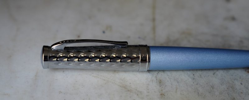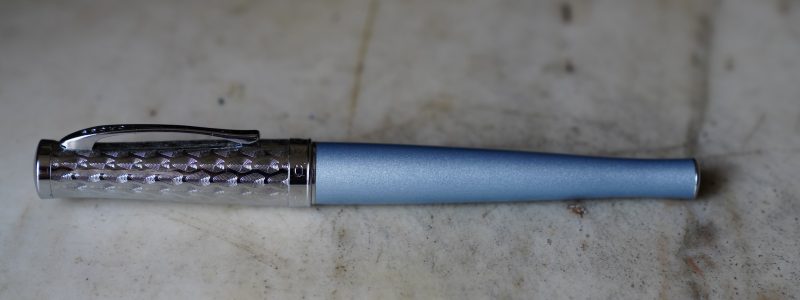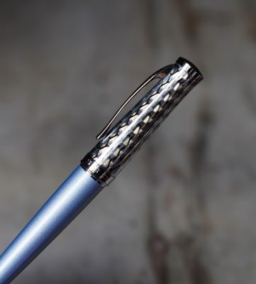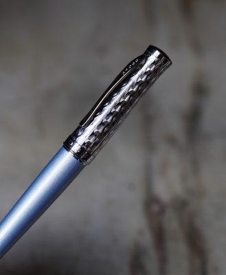 Réalisé en Laque Bleu clair perlée, Capuchon en métal Chromé