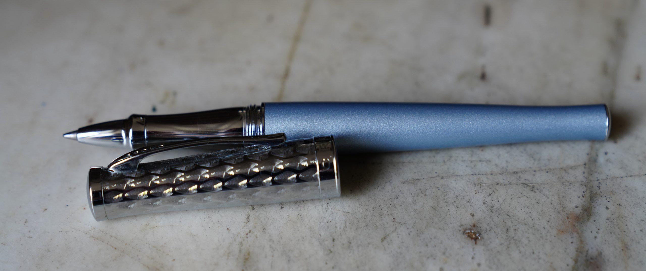 Réalisé en Laque Bleu clair perlée, Capuchon en métal Chromé
