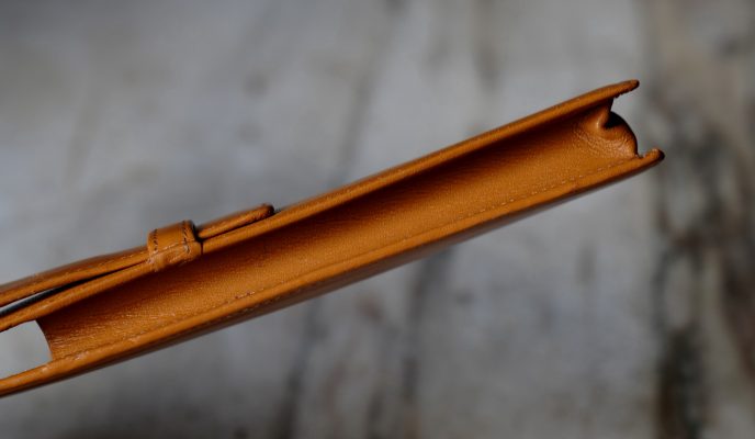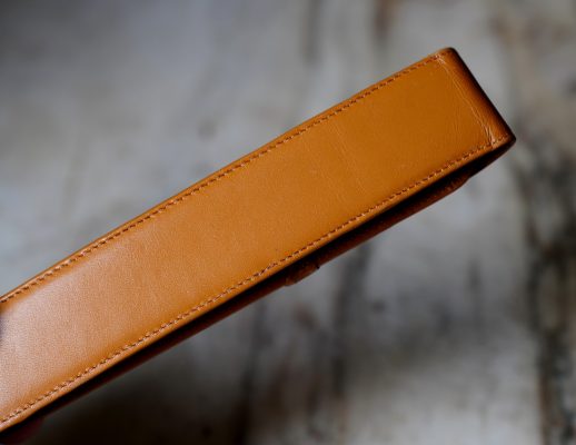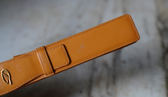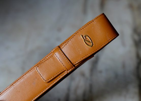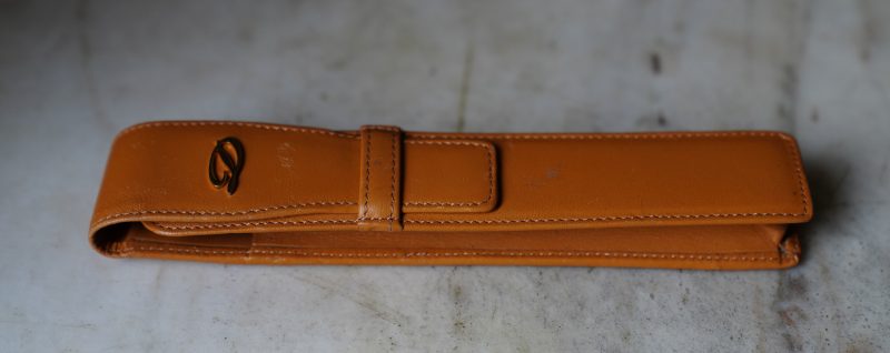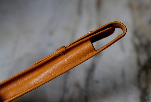 Etui à stylos réalisé en cuir marron clair, modèle une place