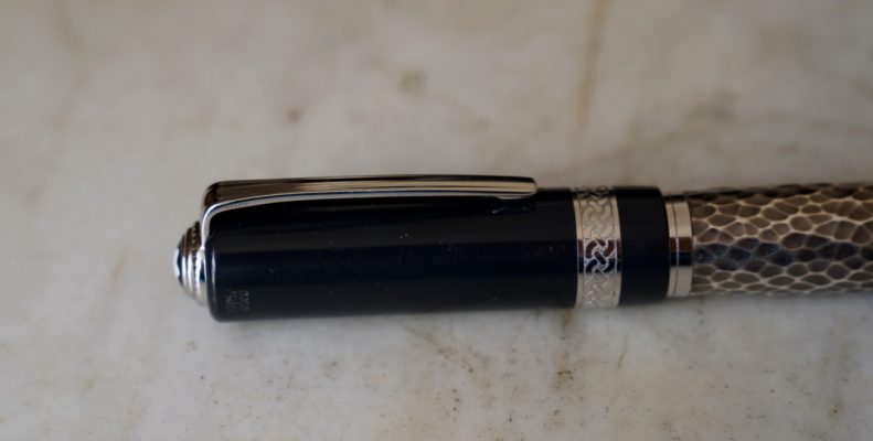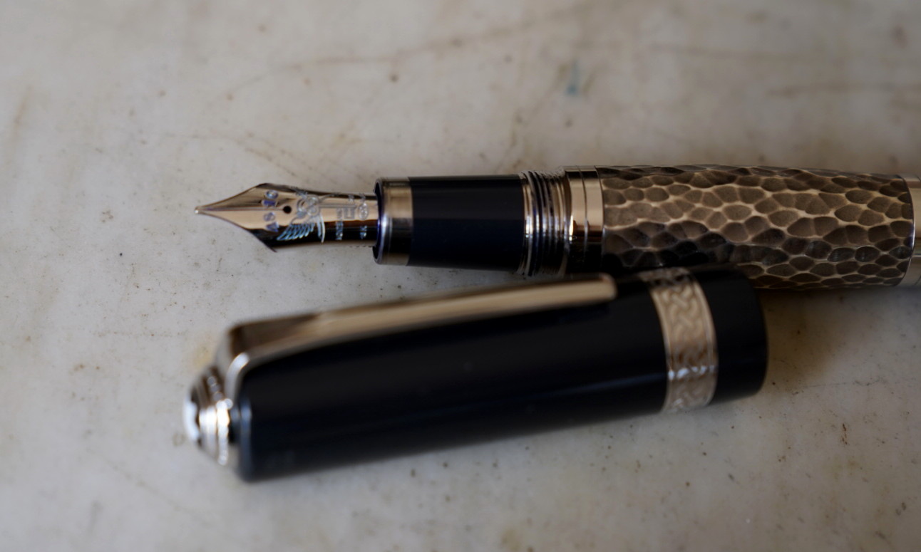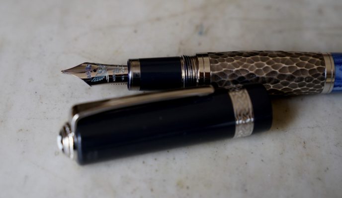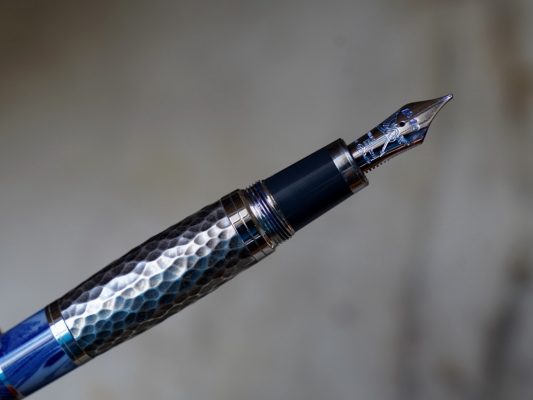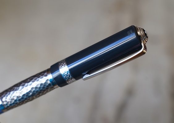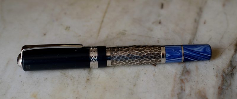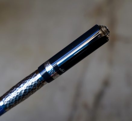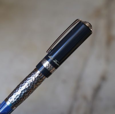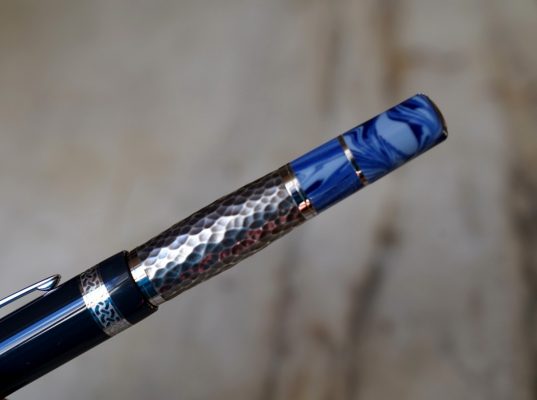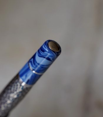 Le corps est réalisé en résines bleues de différentes couleur et une partie centrale en métal martellé, représentant le travail
