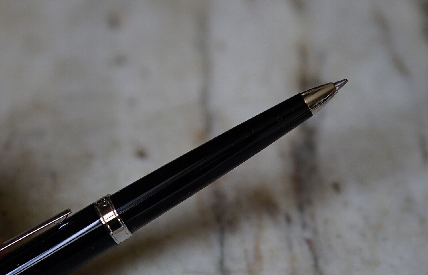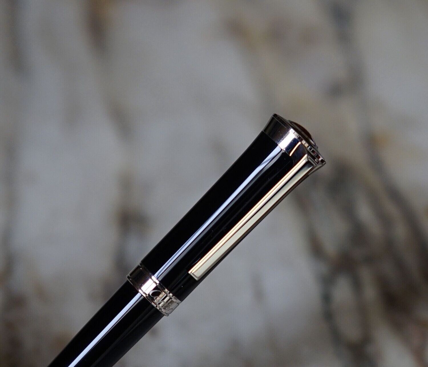 Stylo bille CARTIER art deco résine noire design évasé. Le haut du capuchon est décoré d’un cabochon en résine rouge irisé attributs en plaqué platine. Stylo à recharges cartier, mécanisme « quart de tour ».