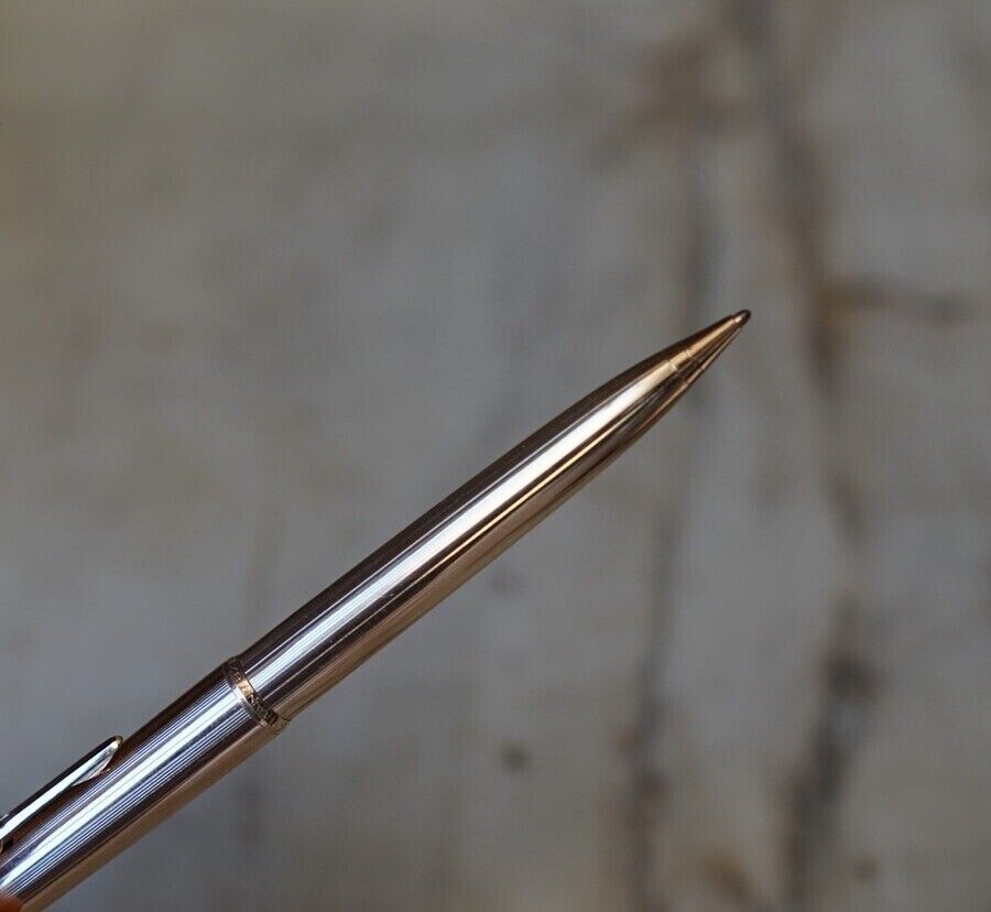 Stylo bille vintage Montblanc 87 plaqué or finition lignée, modèle à levier sur le clip.