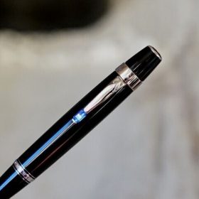 Clip du capuchon orné d’une pierre en résine bleue rappelant le Lapis Lazuli, sur la bague de la partie centrale du stylo on peut lire la mention suivante « MONTBLANC – BOHEME ».