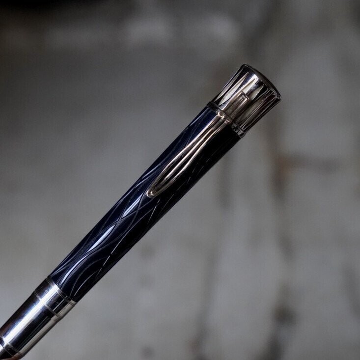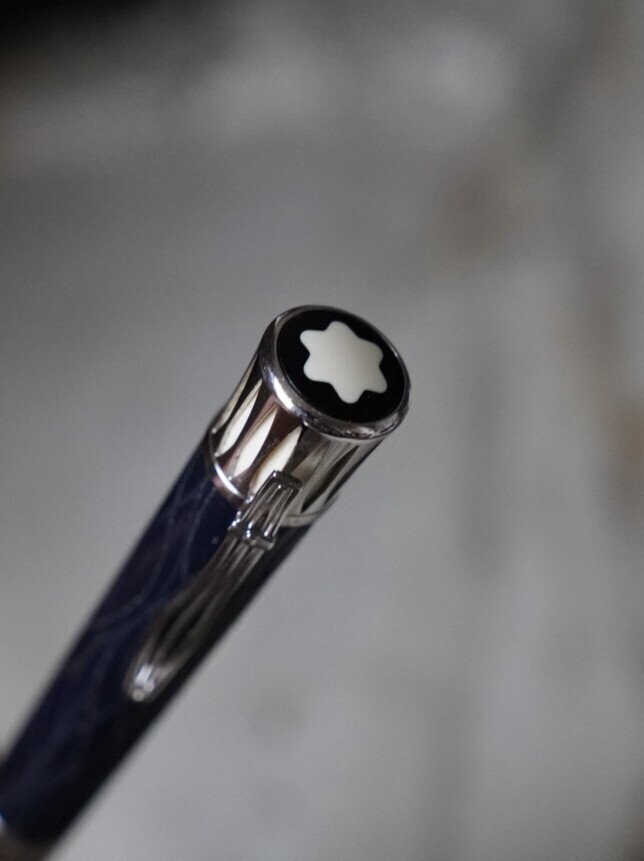Stylo Bille MONTBLANC Mark Twain Edition limitée à 15 000 ex. En hommage au célèbre écrivain américain. Il a écrit les aventures de Tom Sawyer& Huckleberry Fin & s’est inspiré du fleuve du Mississippi, réalisé en résine Bleu profond du fleuve avec un motif de vague. Le haut du stylo rappelle la forme de la cheminée des bateaux à vapeur empruntant ce fleuve à l’époque. Le Clip représente une harpe stylisée un instrument souvent joué lors de la traversée du fleuve.