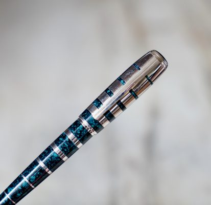 Réalisé en métal et Laque vert foncé marbrée, au design évasé