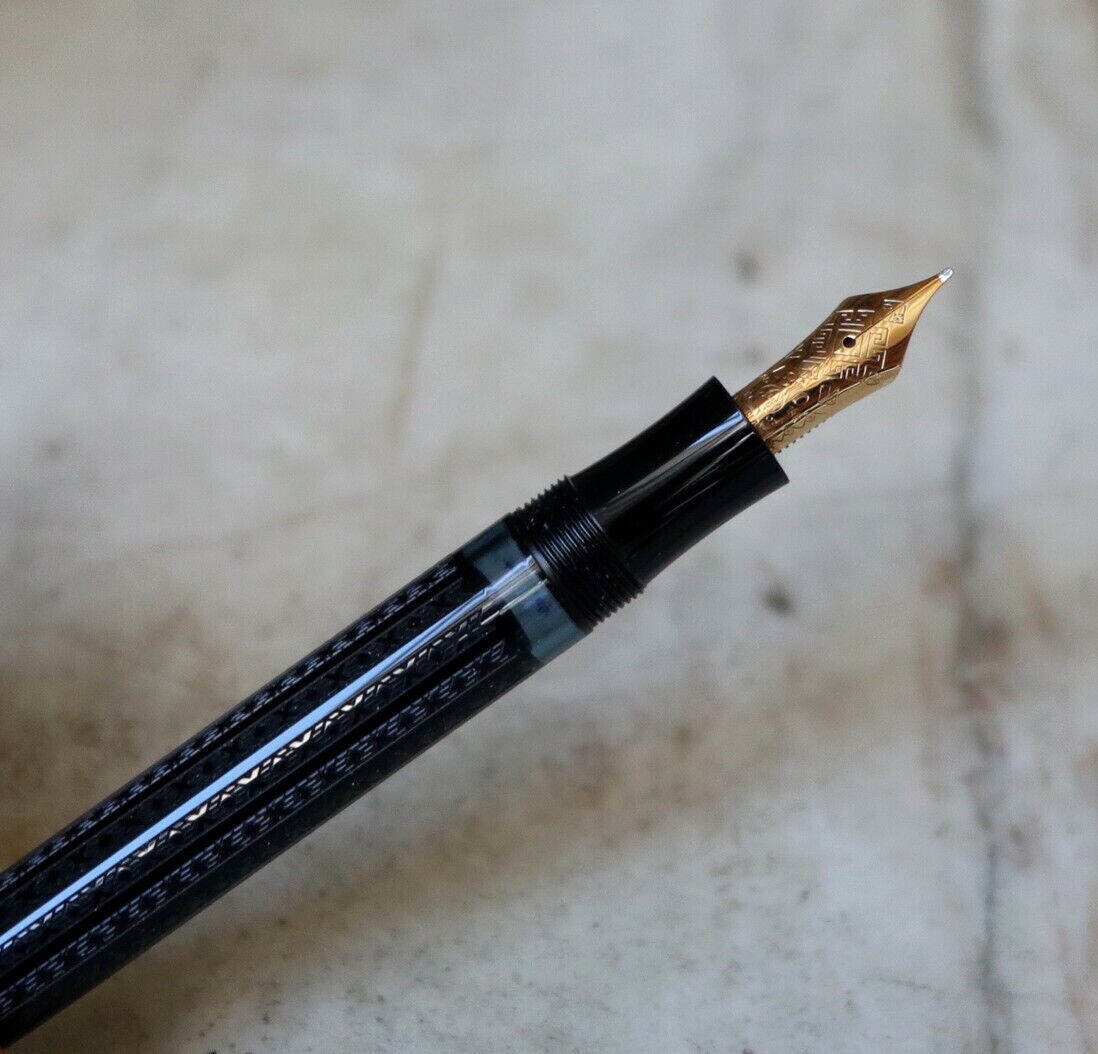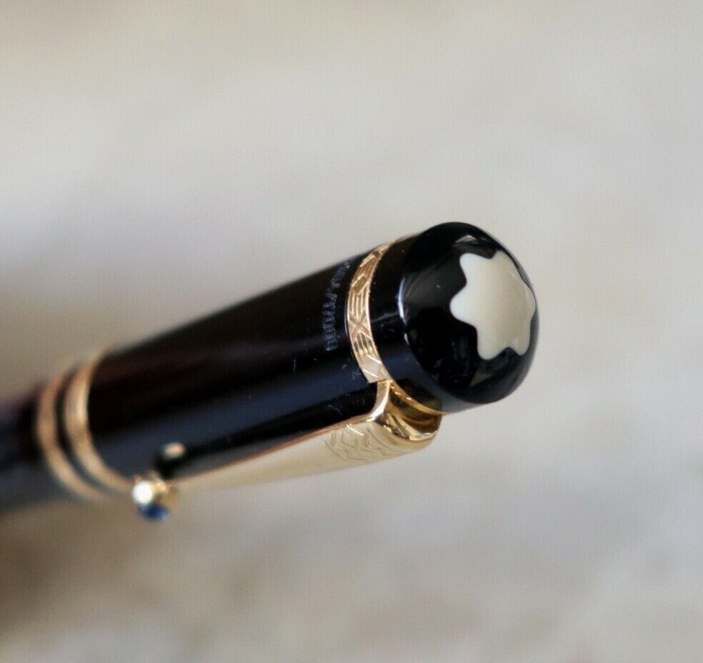 Stylo plume à piston MONTBLANC Dostoïevsky rare en résine précieuse noire finement ciselée. Plume en or massif 18 carats de taille M – moyenne gravée de la mention suivante « 4810 – 750 – 18K – 1997 » , série écrivains limitée à 17000 exemplaires en hommage au célèbre écrivain russe. Présence de deux bagues centrales en plaqué or ciselé dans le bas du capuchon, le clip est orné d’une pierre style saphir.