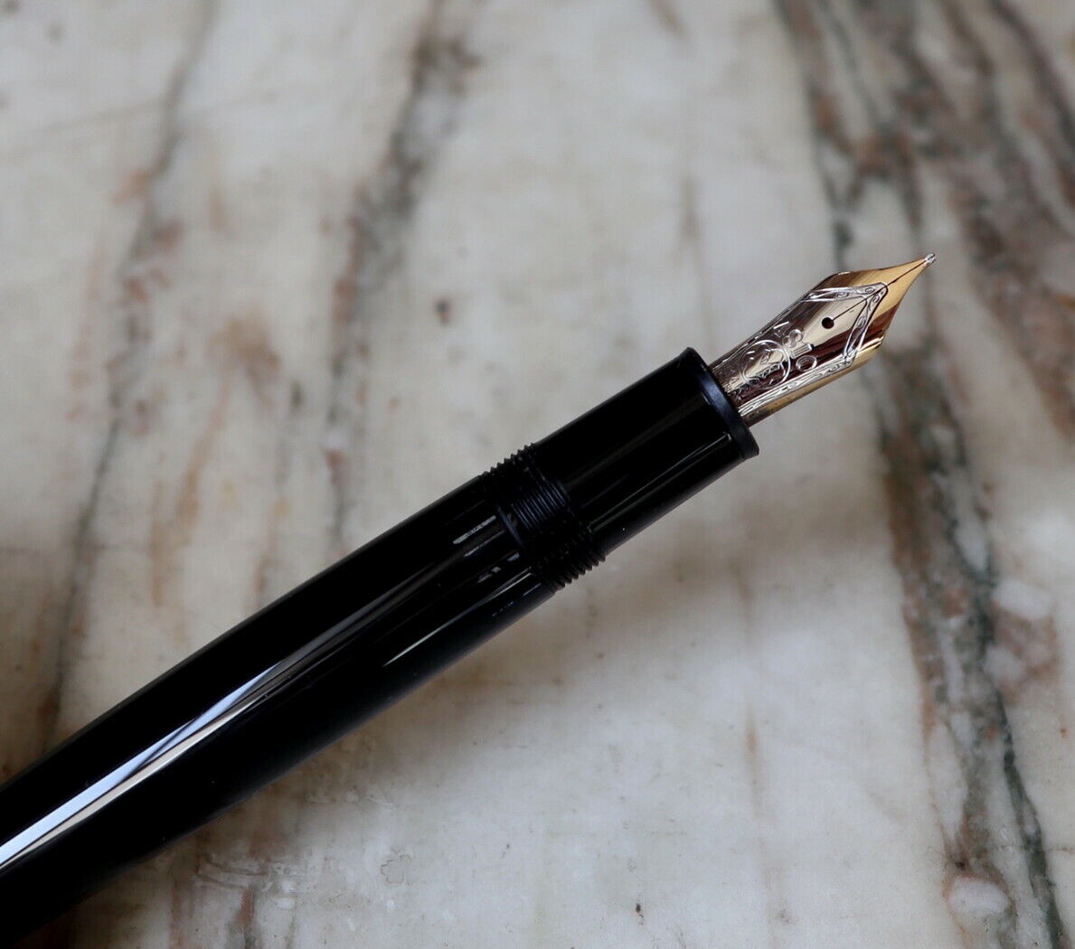 Le stylo fonctionne avec une pompe pour une utilisation pratique et sans encombre. Sa plume en or massif 14 carats est gravée avec soin de la mention « 4810 – M – 14K – MONTBLANC – 585 », accompagnée du logo emblématique de Montblanc. La plume est de taille moyenne, offrant une expérience d’écriture fluide et agréable.