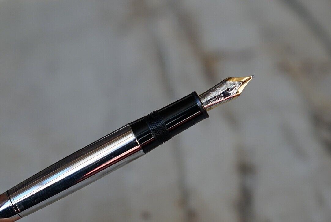 Stylo plume MONTBLANC Meisterstück 146 doué hématite. Stylo à pompe, corps en acier plaqué platine, finition lisse.