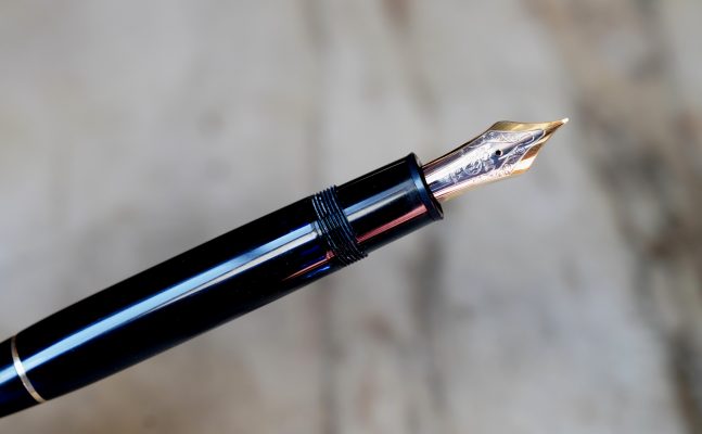 Grand stylo plume à pompe réalisé en résine noire, attributs en métal plaqué or