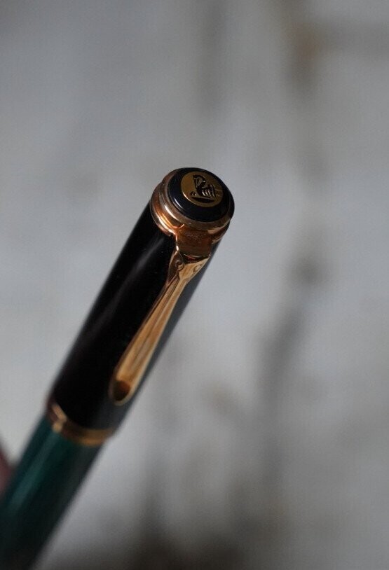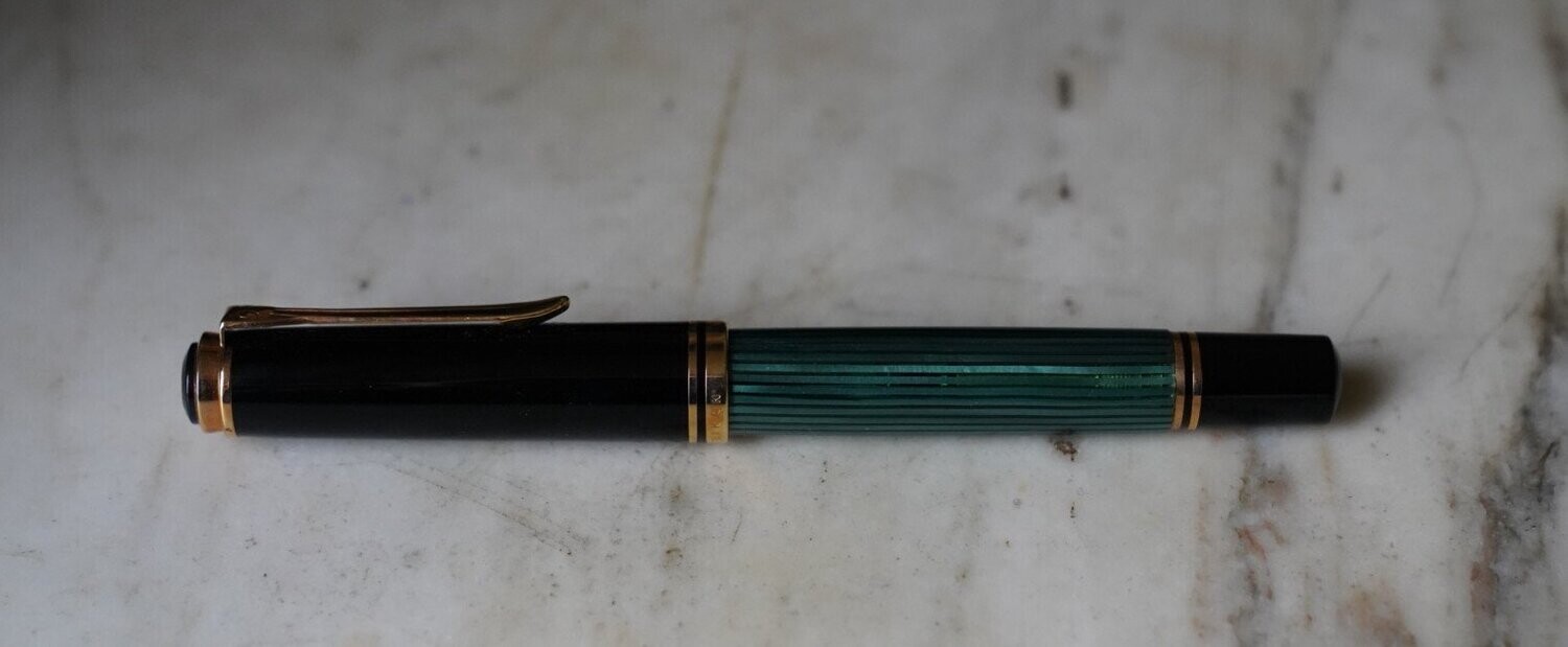 Stylo plume à pompe Pelikan M 800, réalisé en résine verte striée & noire. Plume en or massif 18 Carats de taille F – Fine.