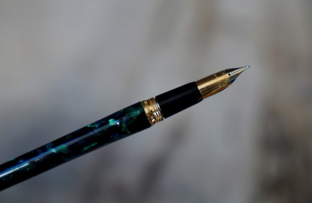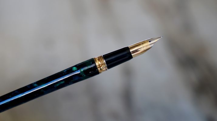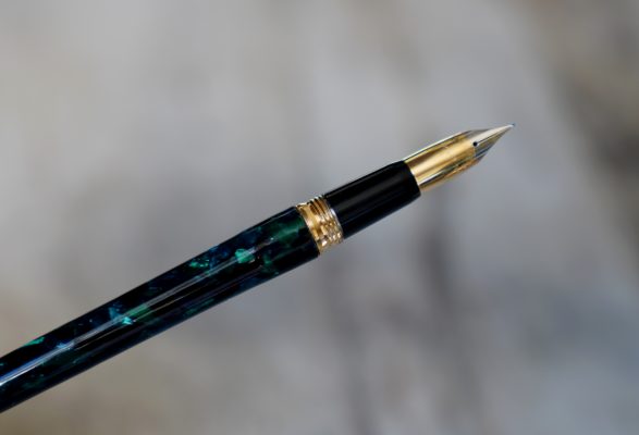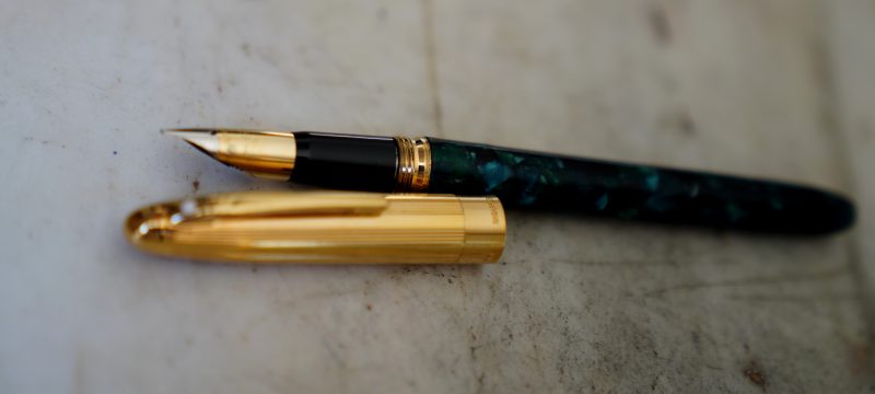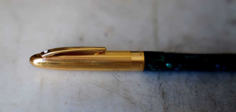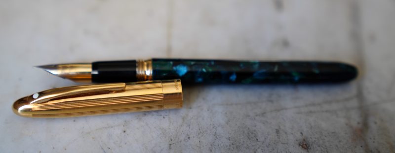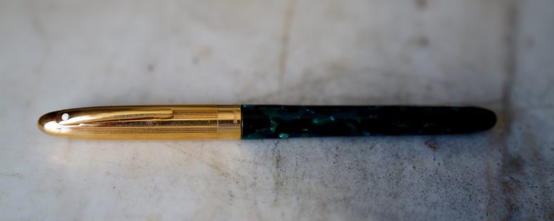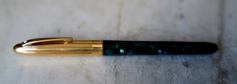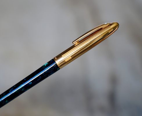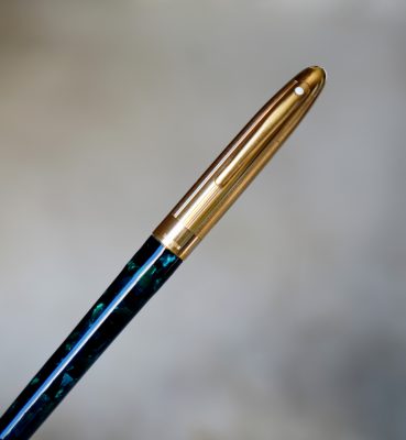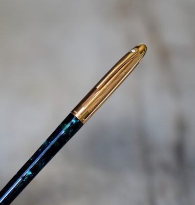 Stylo plume de la gamme Crest Réalisé Laque Verte marbrée, capuchon plaqué Or Attributs en métal plaqué Or 18 Carats Fermeture vissée Plume en Or massif 18 Carats, de taille Moyenne ou entre Fine & Moyenne Elle est gravée de la mention / SHEAFFER – 18k -750 / |