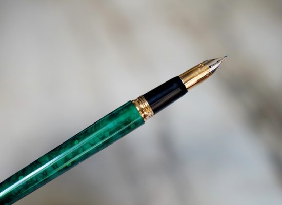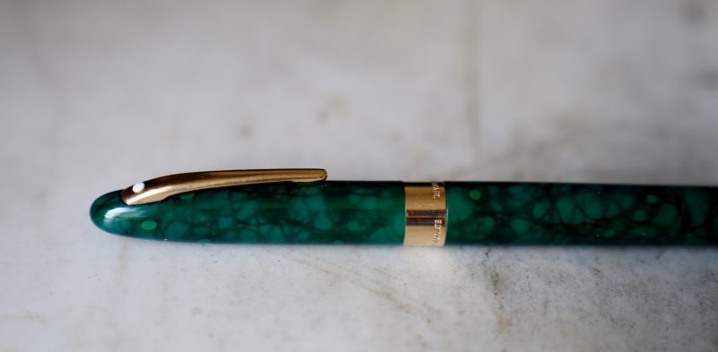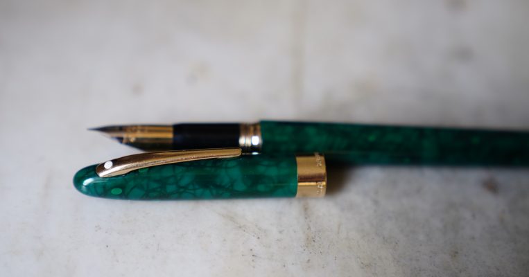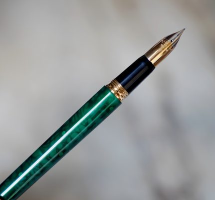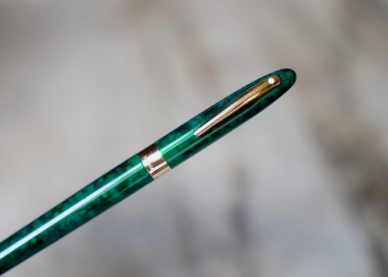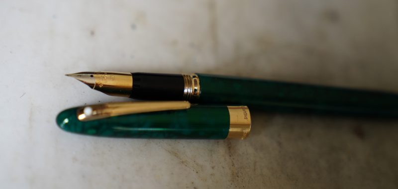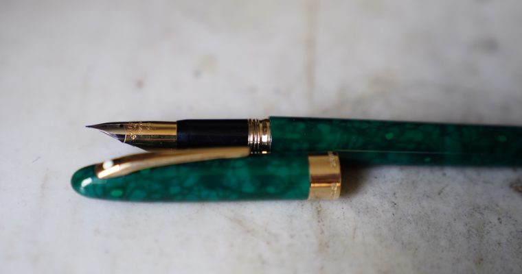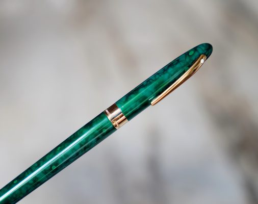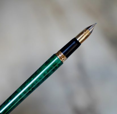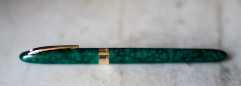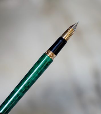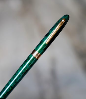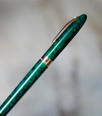 Réalisé en Laque verte marbrée, attributs en métal plaqué Or