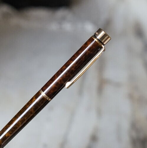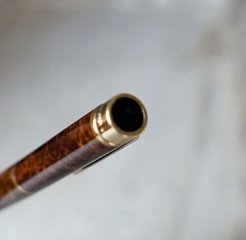 Stylo plume SHEAFFER Targa laque Thuya Ronce, attributs en plaqué Or 18 carats. Plume en or massif 18 carats de taille M – moyenne sur laquelle est gravée la mention « SHEAFFER – 18K ». Fermeture à clips.