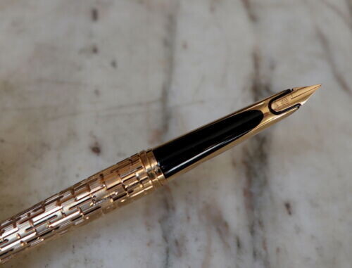 Stylo plume WATERMAN CF rare, plaqué or finition crocodile. Sur le bas du capuchon est gravée la mention suivante: « WATERMAN-C/F – plaqué Or G – MADE IN FRANCE ». Plume en Or massif 18 carats, plume de taille Moyenne, fermeture clippée.