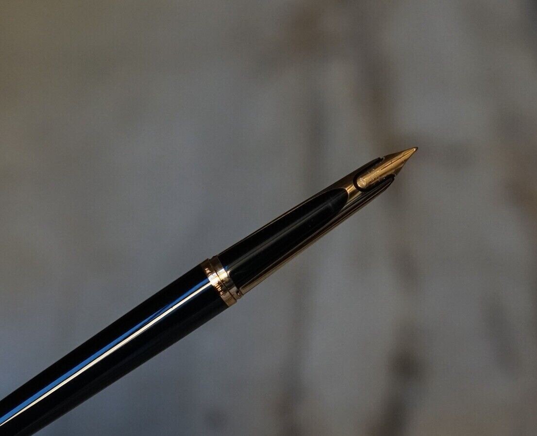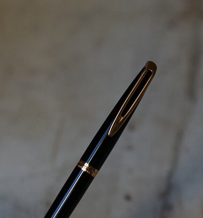 Stylo plume de la gamme CF rare, réalisé en laque noire attributs en plaqué Or 18 Carats. Plume en or massif 18 carats, de taille M – moyenne. Fermeture à clips.