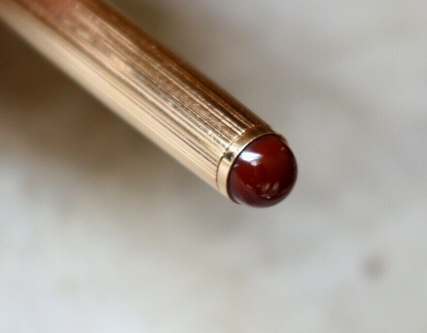 Stylo plume WATERMAN Goutte plaqué or. Cabochons couleur ambre finition godrons, sur le bas du capuchon est inscrite la mention suivante « Made in France – WATERMAN plaqué or G ». Plume en or massif 18 carats de taille M – moyenne, elle est gravée de la mention suivante « 18K – 750 ».