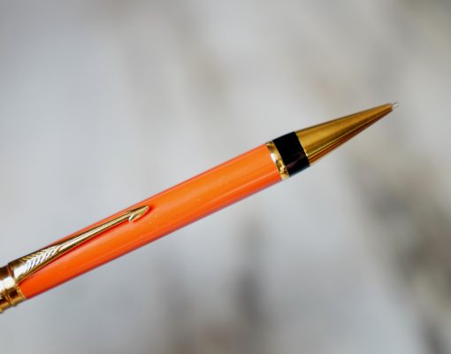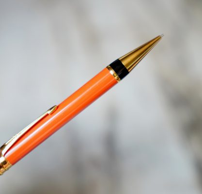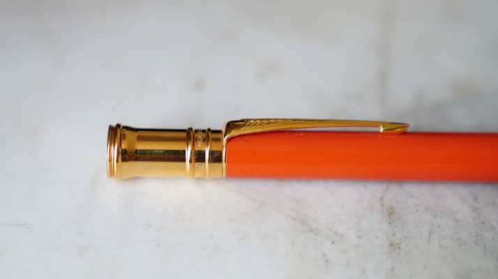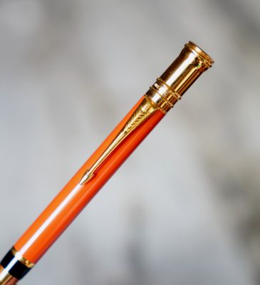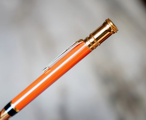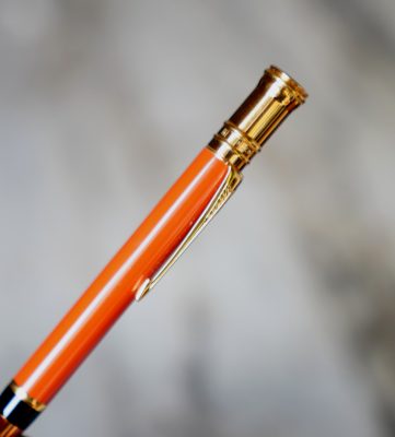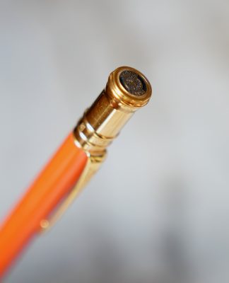 Réalisé en résine orange, attributs en métal plaqué Or 18 Carats